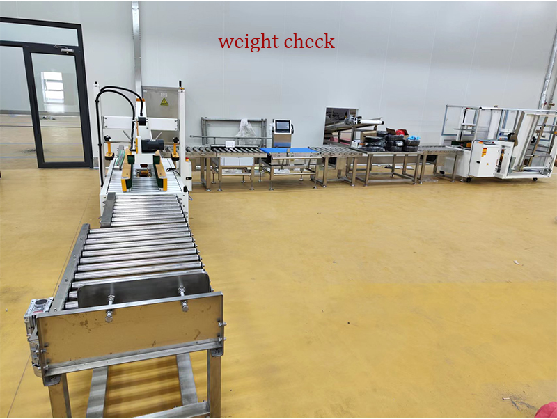 Human mapuno ang mga bag sa frozen nga pagkaon, ang matag bag gisusi pag-usab sa usa ka weight detector aron maseguro nga ang gibug-aton mohaum sa target nga gibug-aton, ug dayon moagi sa usa ka metal detector aron masiguro nga walay metal nga gisagol sa matag bag. Ang mga bag dayon gidala sa linya sa pagpuno sa karton.