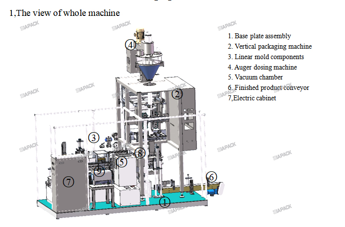 This vacuum packaging machine can realize fully automatic bag making, bag removal, feeding, weighing, material vibration, shaping, vacuuming, sealing, and finished product delivery in one, and pack loose materials into fixed-weight molding with high added value. The hexahedral package. This unit is widely used in the vacuum packaging of grain products such as rice miscellaneous grains and powder materials. The bags are beautiful in shape and good in sealing effect, which is convenient for boxing, boxing or direct retailing.