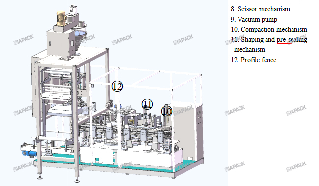 Bag forming→bag picking→cutting→vibration→shaping and pre-sealing→vacuumizing→bag dropping and pushing→finished product delivery