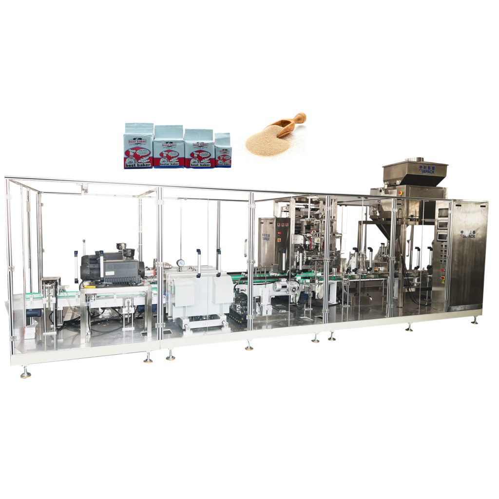 Kini nga makina naglakip sa usa ka set ZK3 vacuum elevator alang sa pagpakaon sa uga nga yeast, usa ka set ZL520 vertical nga bag nga naghimo sa packing ug sealing machine.usa ka set ZLC4-2000 upat ka balde nga weighing machine, Usa ka set ZL-100V2 Double vacuum chamber packing machine. Kini nga makina kaylap nga gigamit alang sa pagputos sa kemikal sa parmasya sa pagkaon ug uban pang produkto sa powder o gamay nga granule. Sama sa kape nga powder, yeast powder nga harina sa trigo ug uban pa .Ang tibuok makina nga nagsagop sa sulod nga pumping sa vacuum nga produkto. Taas kaayo ang vacuum degree ug taas kaayo ang packing speed mahimong reach30bag/min .Ang nahuman nga produkto adunay taas nga estante sa kinabuhi ug nindot nga porma.