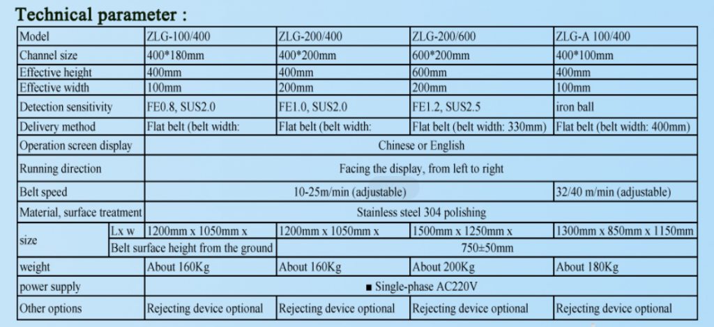 Sa tinuud alang sa pagsusi sa ferrous & stainless steel sa aluminum foil packages, sama sa chocolate, potato chips, milk powder sausage, pickled nga mga produkto ug uban pa.